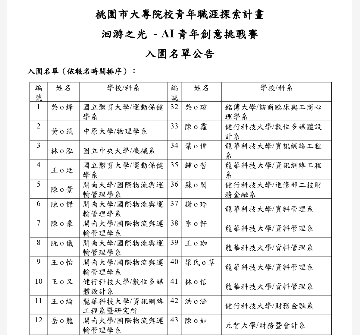 恭喜本系多位優秀校友入圍 桃園市大專院校青年職涯探索計畫「洄游之光–AI青年創意挑戰賽」 獎勵!