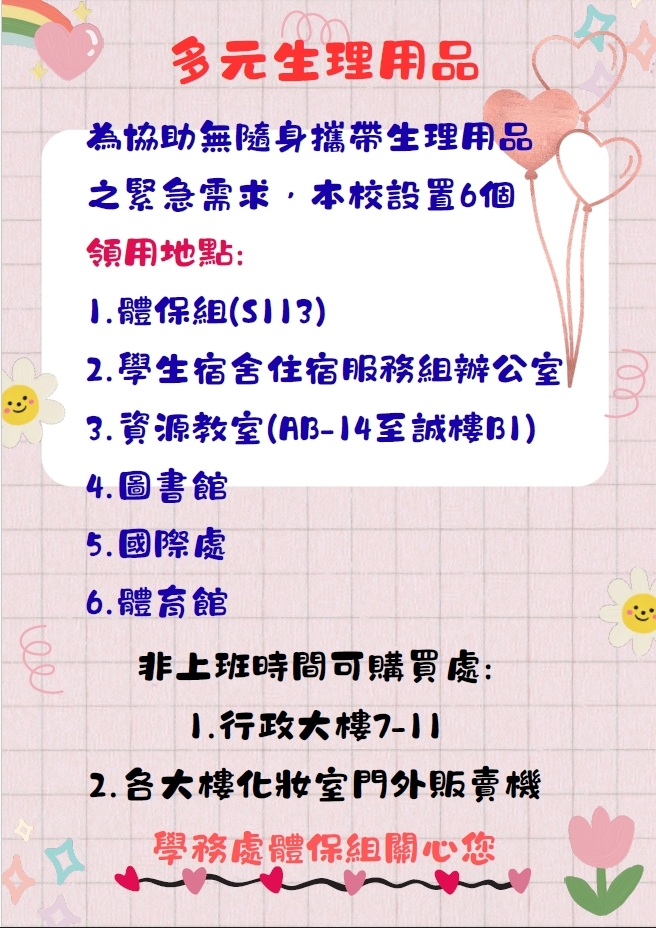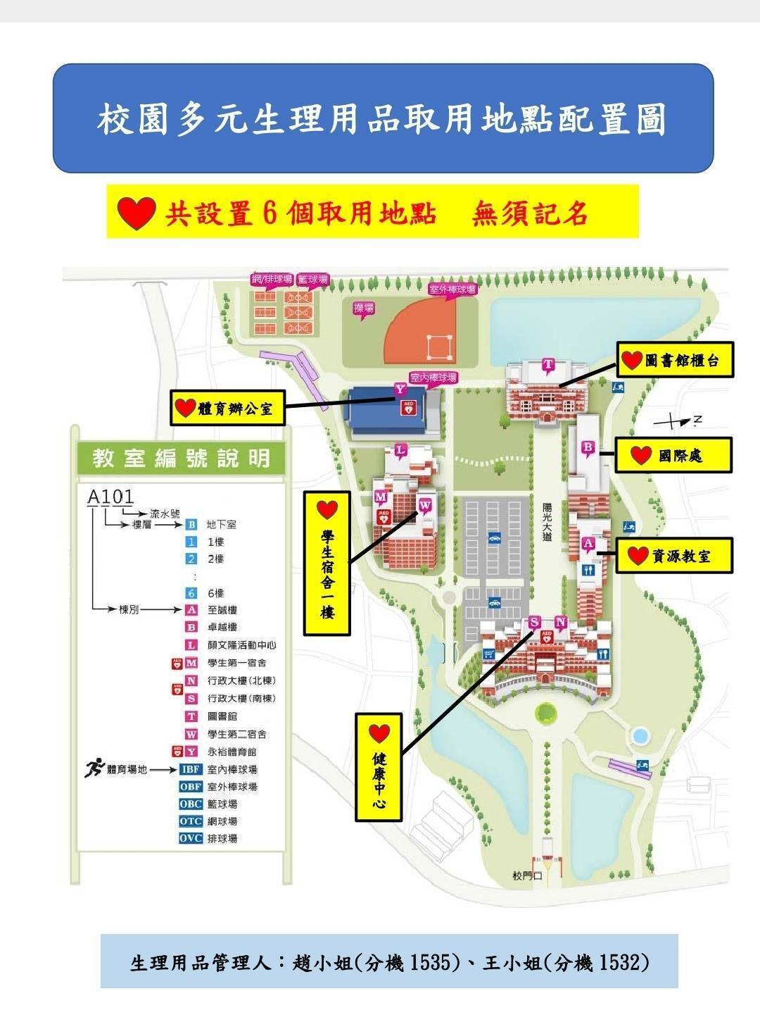 為協助未隨身攜帶生理用品有經期生理需求之學生及進入部屬場館之民眾可因應緊急需求,本校於健康中心(體保組S113)、宿舍一樓辦公室、資源教室(AB-14)等共6處地點備有多元生理用品,如有緊急需求者可至上述地點取用(取用地點如下圖)!!!